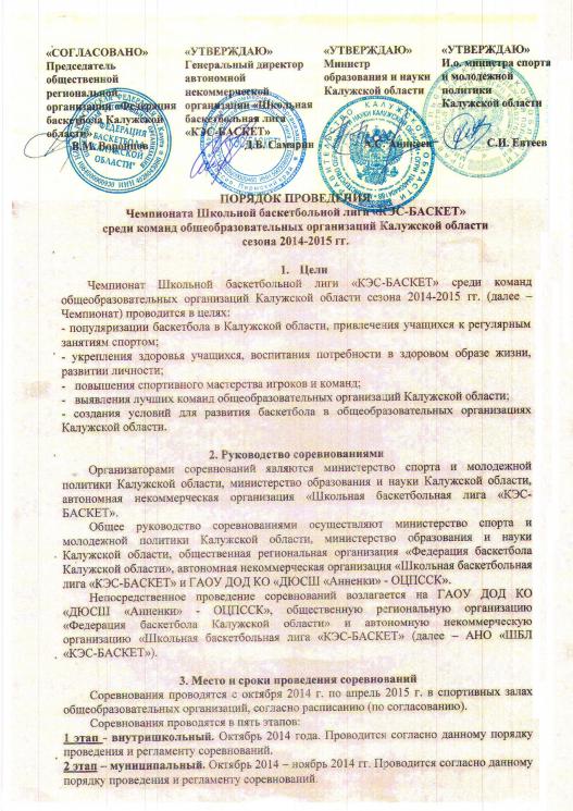 В начале сентября Министром образования и науки Калужской области Александром Сергеевичем Аникеевым, И.о. министра спорта и молодежной политики Калужской области Сергеем Ивановичем Евтеевым, Председателем ОРО «Федерация баскетбола Калужской области» Валерием Михайловичем Воронцовым и Генеральным директором Чемпионата ШБЛ «КЭС-БАСКЕТ» Самариным Дмитрием Владимировичем был подписан ПОРЯДОК ПРОВЕДЕНИЯ Чемпионата Школьной баскетбольной лиги «КЭС-БАСКЕТ» среди команд общеобразовательных организаций Калужской области (скачать). Заявочная кампания на участие в Чемпионате идёт полным ходом. Всех участников просим подавать заявки на сайте http://kes-anketa.ru/. Заявки принимаются до 17 октября 2014 года. Напоминаем, что муниципальный этап в некоторых районах области стартует в октябре месяце. На продолжении уже многих лет каждая школа-участница Чемпионата получает комплект баскетбольных мячей (3 мяча — № 7 и 3 мяча — № 6) от Школьной баскетбольной лиги «КЭС-БАСКЕТ».