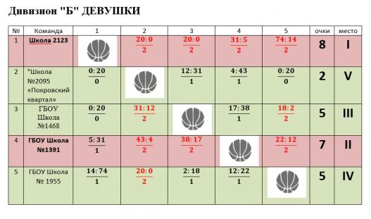 Девушки из ДИВИЗИОНА «Б» разыграли призовые места в дивизиональном этапе. В следующем этапе примут участие Школа №2123 и Школа №1391, которая с первого года своего участия в Чемпионате показывает рост своего мастерста. Третье место заняла комада многократно участвующая в играх на вылет в прошедших сезонах Школы № 1955.