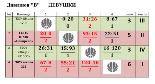 Девушки из ДИВИЗИОНА «В» первыми разыграли призовые места в дивизиональном этапе. Третье место заняла команда Школы № 1236. В следующем этапе примут участие победители Школа №222 и ШМК «Бибирево» занявшая второе место.