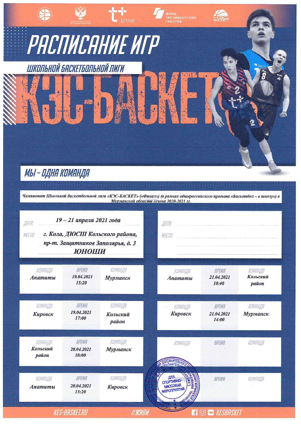 Расписание регионального этапа среди команд юношей