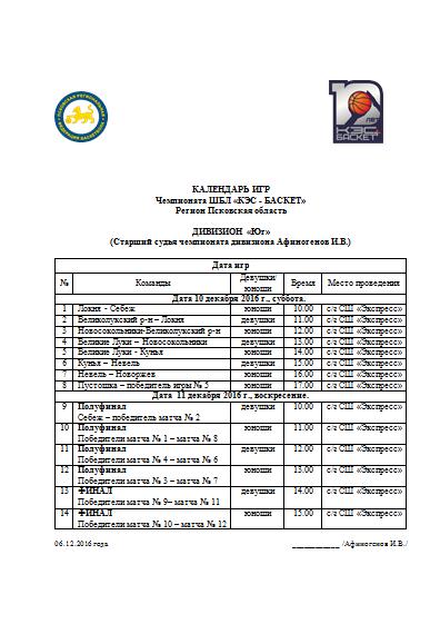 Расписание матчей Дивизиона «ЮГ» Чемпионата «ШБЛ КЭС-БАСКЕТ» Псковской области