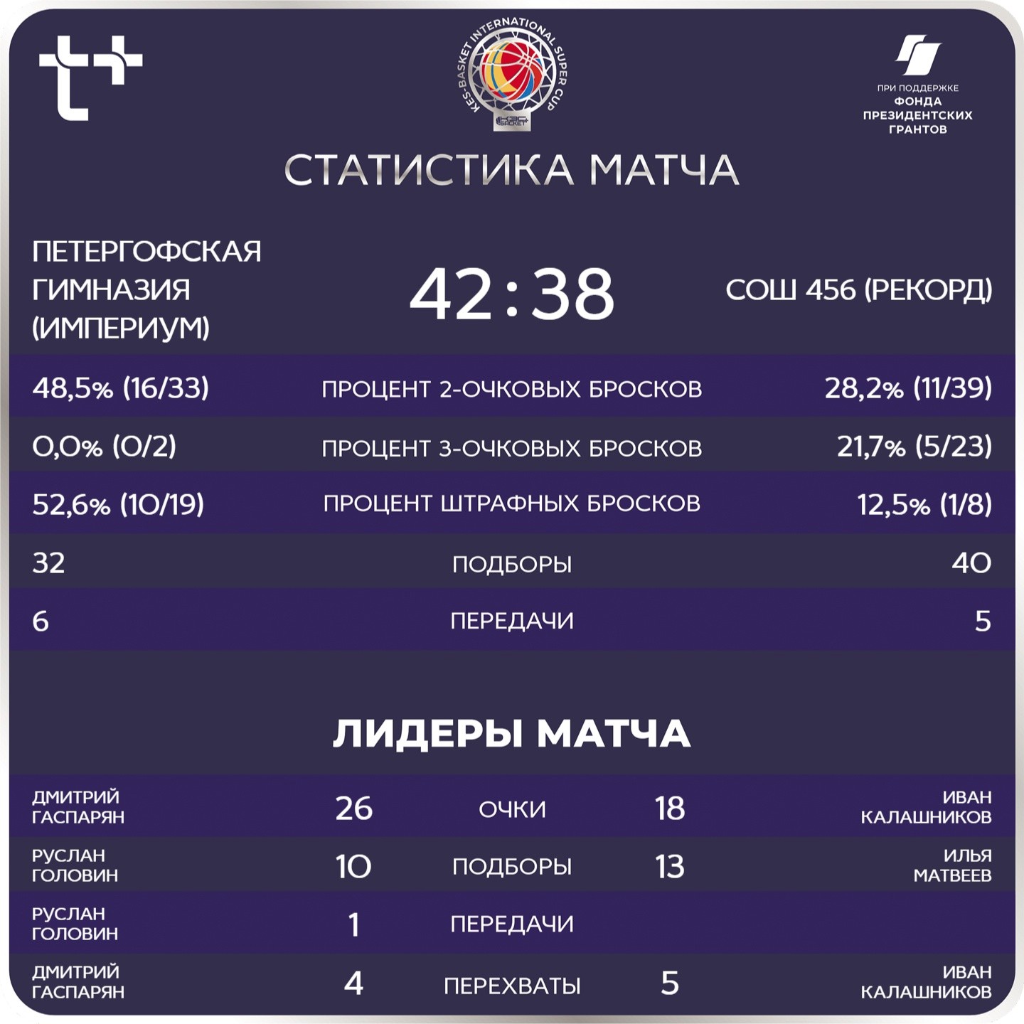 Логичный тайм-аут, 456-ая вбрасывает в передовой, пас на открытого Климушева в углу, бросок и, к сожалению, очень мимо мяч летит прямо в верхний край щита и подбор остается за Петергофской. Далее следует быстрый фол на Гаспаряне и Дима опять забивает 1 из 2 штрафных, по сути, решая все вопросы о победителе.