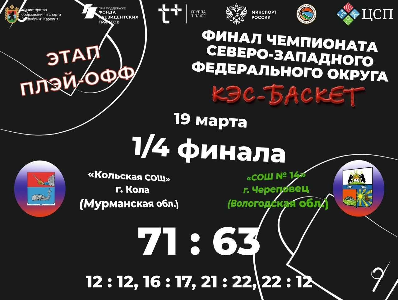 Счет по четвертям 12:12, 16:17, 21:22, 22:12.